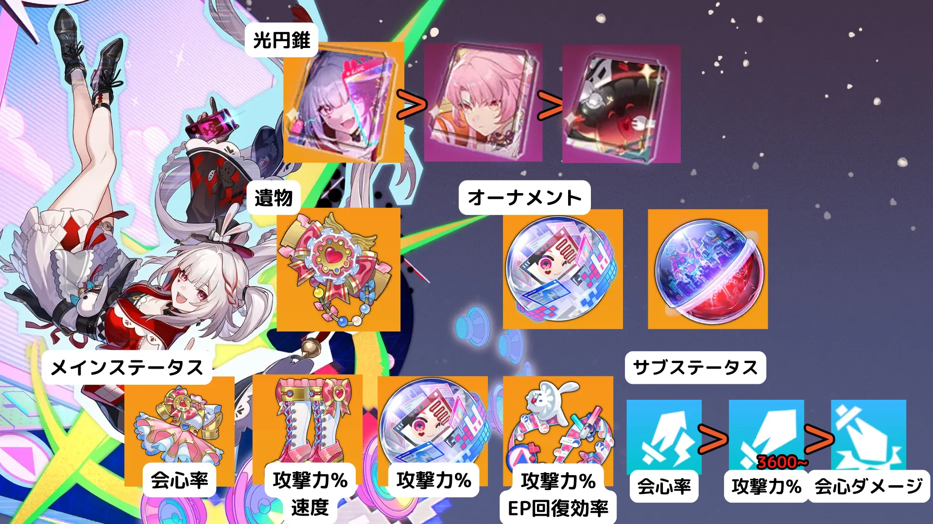 ![]() 会心率 | ![]() 攻撃力 速度 | ![]() 攻撃力 | ![]() EP回復効率 攻撃力 |